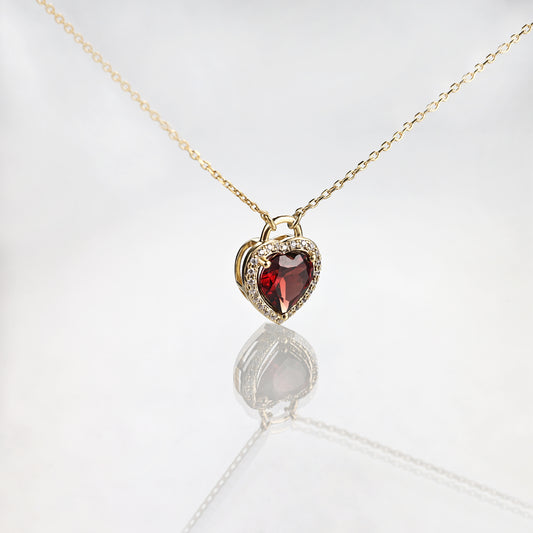 Solid Gold Red Garnet Heart Lock Pendant