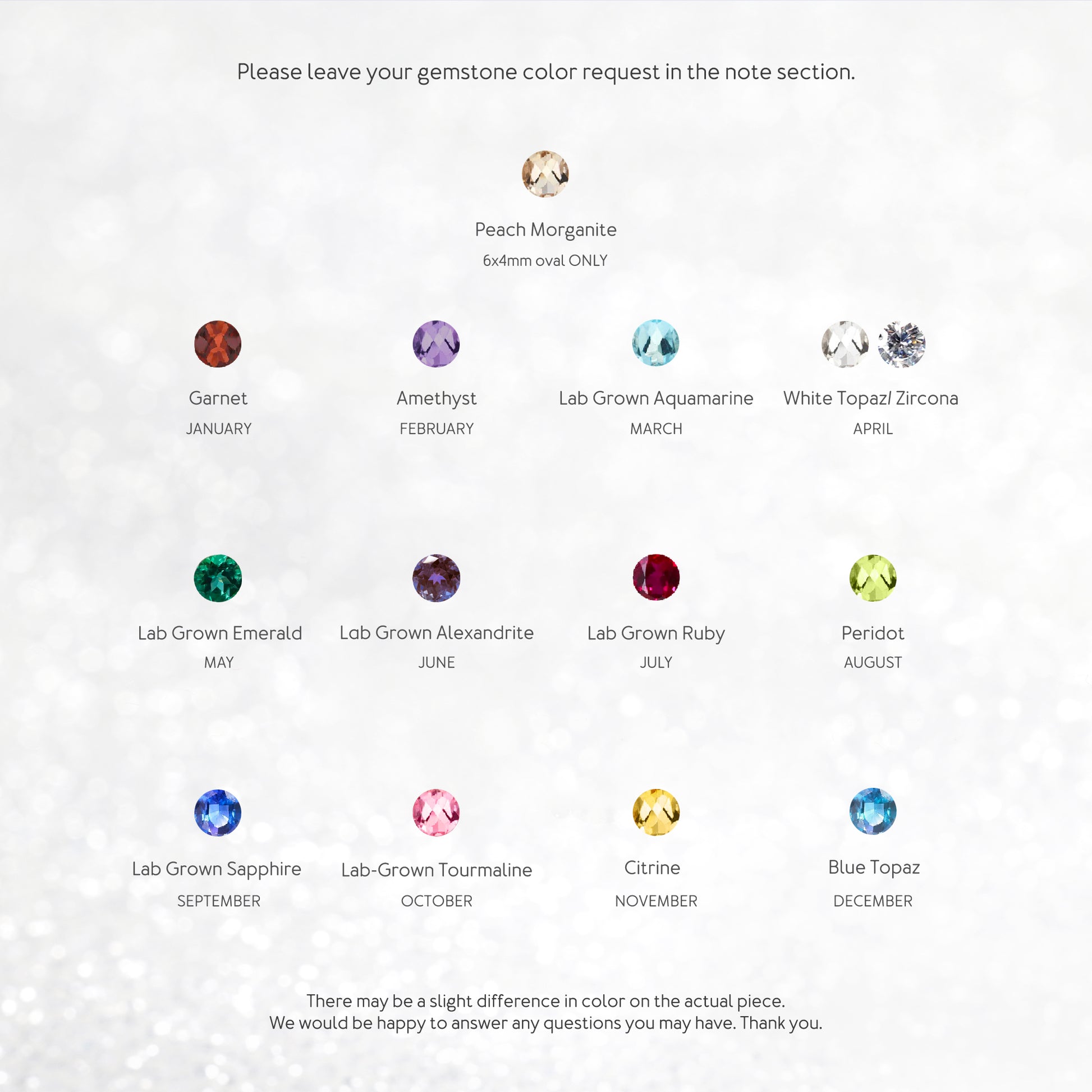 如需客製化寶石選項,請在訂單特殊說明框(購物車頁面)中填寫您的生辰石。